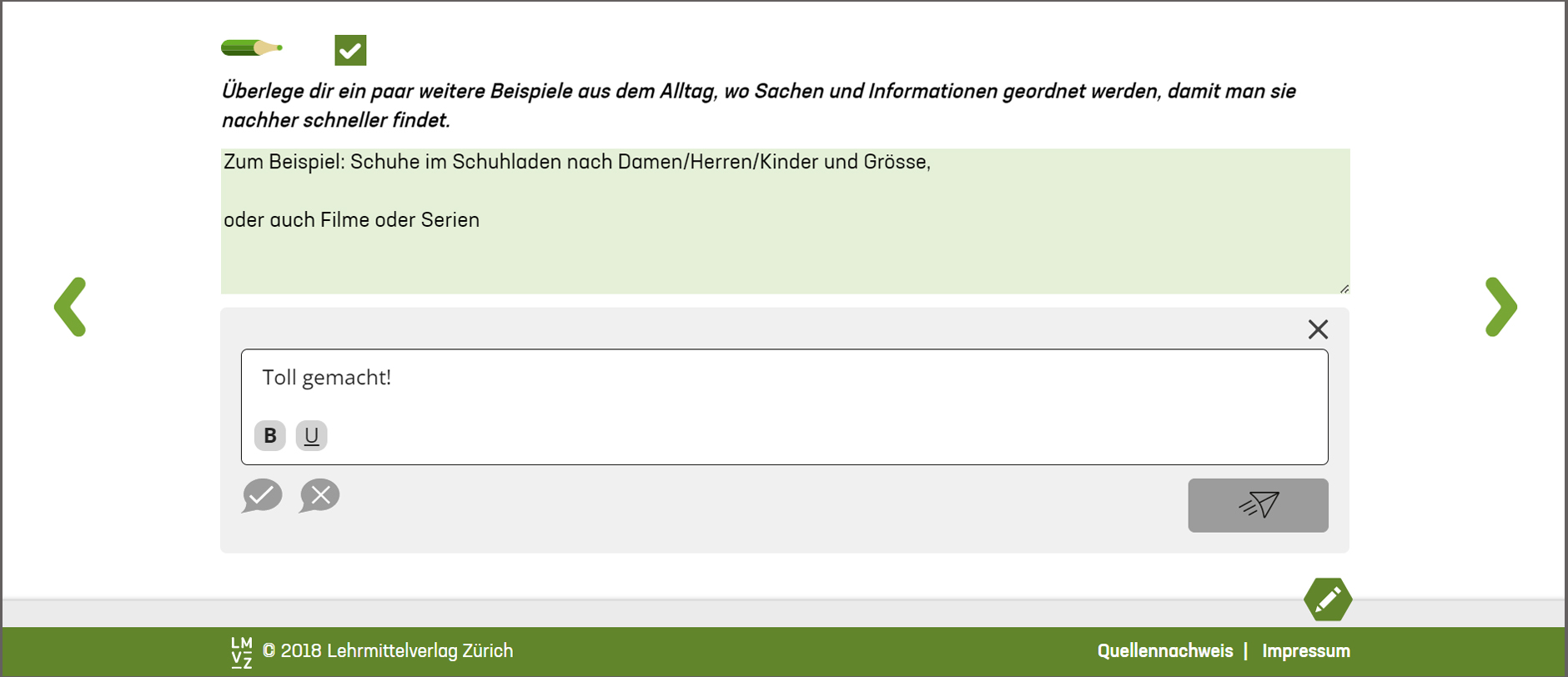 Die neue Funktion ermöglicht Lehrpersonen, ihren Schülerinnen und Schülern schriftlich Rückmeldung zu geben auf die in den digitalen Lehrmitteln gelösten Aufgaben. Voraussetzung ist, dass sowohl Lehrpersonen als auch Schülerinnen und Schüler mit der volldigitalen Version des jeweiligen Lehrmittels arbeiten.