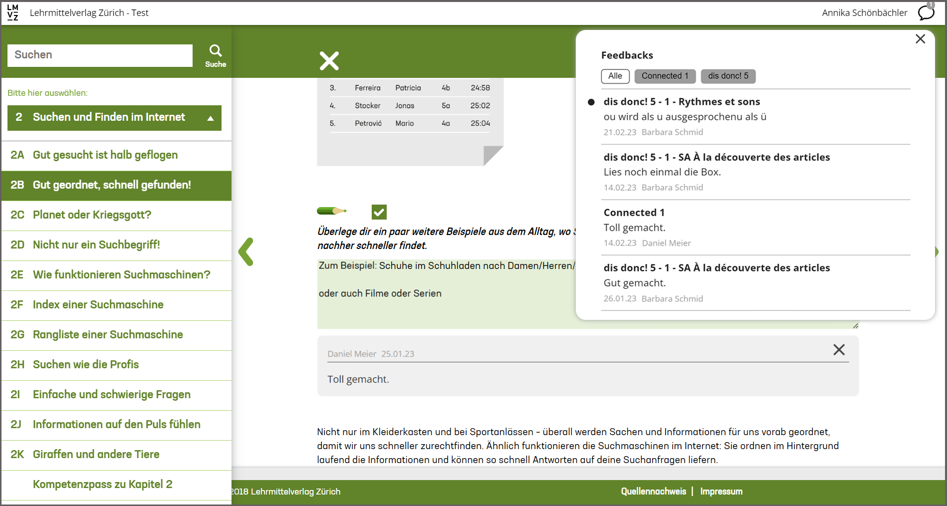 Neu haben Lehrpersonen die Möglichkeit Ihren Schülerinnen und Schülern in ausgewählten digitalen Lehrmitteln schriftliches Feedback zu geben.